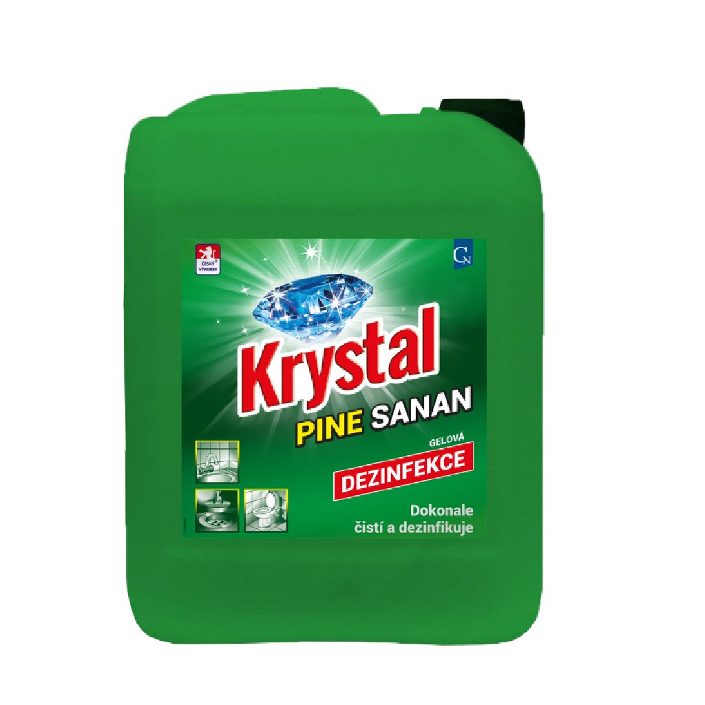 Krystal PINE SANAN je vysoce účinný čistící alkalický a extra hustý čistící a dezinfekční gel. Odstraňuje tuky, bílkoviny, usazenou špínu a skvrny. Dobře působí i na těžko dostupných místech. Snadno přilne k povrchu i na svislých plochách, takže zvyšuje mycí i dezinfekční účinek. Ničí bakterie, likviduje nepříjemný zápach, dezinfikuje, čistí a bělí. Je vhodný pro použití v domácnostech, zdravotnictví, potravinářství a v zemědělství. Je vhodný zejména na záchodové mísy a pisoáry, umyvadla, vany, dřezy, podlahy, kachličky, pracovní plochy a odpady. Synergický účinek směsi tenzidů a přísady s bělícími vlastnostmi předurčuje tento výrobek k širokému použití v různých oblastech. Pěnivost prostředku zvyšuje smáčecí schopnosti.