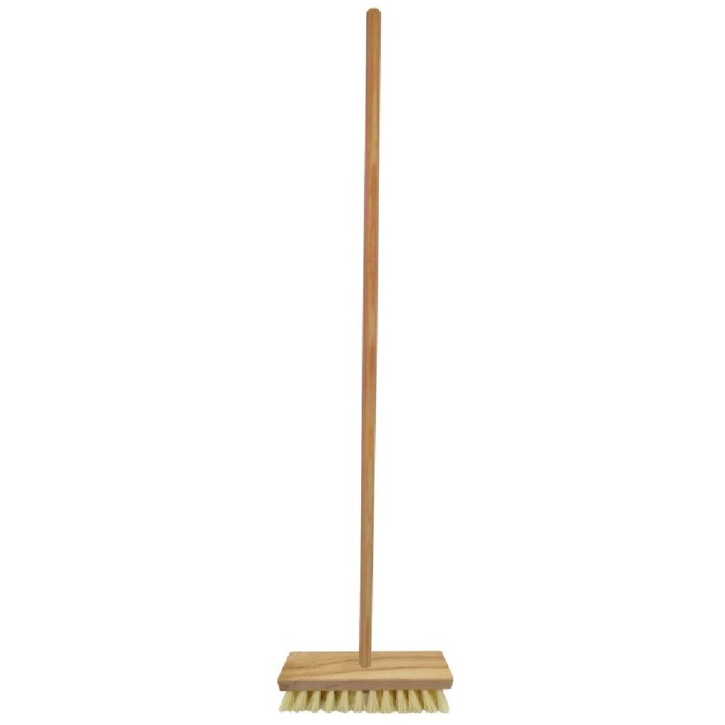 Tvrdý kartáč rýžák na podlahu, dřevěné nelakované hranaté tělo, vlnitá syntetická vlákna.