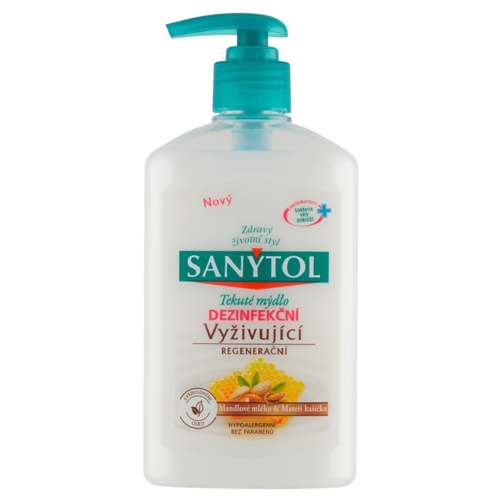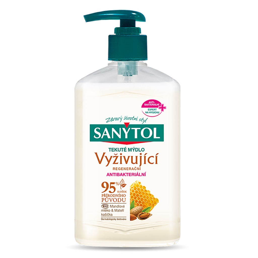 Antibakteriální vyživující a regenerační tekuté mýdlo SANYTOL, dermatologicky a klinicky testované, má hypoalergenní složení, které je obohaceno o přírodní výtažky z mandlového mléka a mateří kašičky.