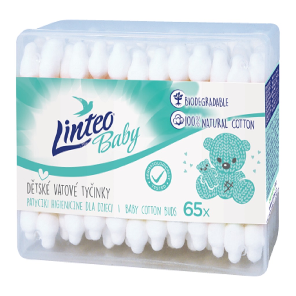 Vatové tyčinky Linteo Baby jsou speciálně navrženy pro dětská ouška. Díky pevnému návinu jsou i pro nejmenší děti bezpečná.